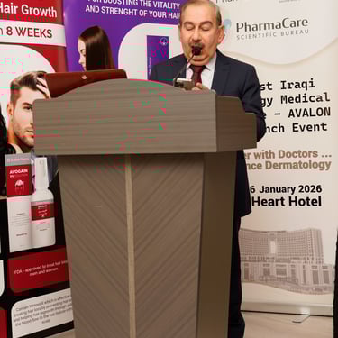 On Friday, January 16, 2026, the Scientific Conference of Dermatology and Venereology was held at Al Misk Hall – Baghdad, with the attendance of distinguished professors, consultants, and dermatologists. The conference was sponsored by Avalon Pharma – Saudi Arabia, in collaboration with the Iraqi Society of Dermatology and Venereology, and organized by Pharmacare Scientific Bureau. The event included official speeches, scientific lectures, and recognition activities within a professional atmosphere supporting continuous medical education.